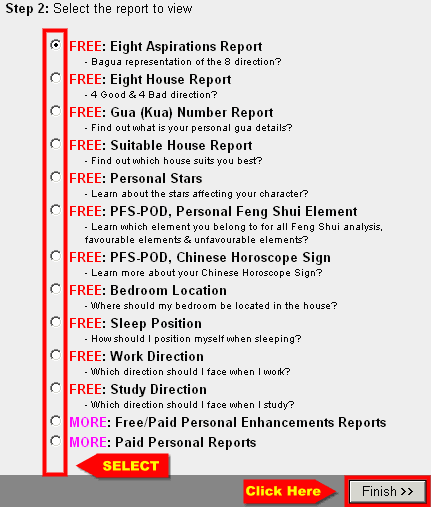 • Next is to select the report to generate. In this case, select the PFS-POD: Personal Feng Shui Element Report and click FINISH.